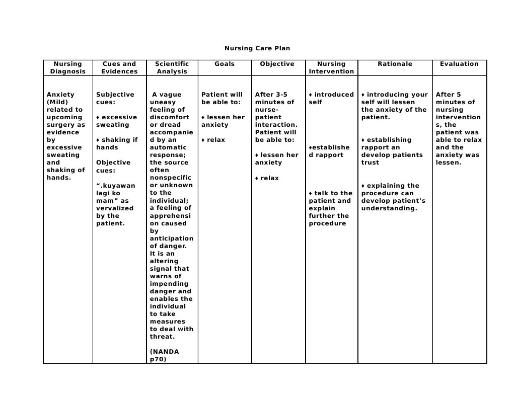 This makes no sense being here. Anxiety is a type of an actual nursing diagnosis that is described as feelings of discomfort and apprehensions in response to the disturbance of the usual concept or pattern situation or environment. Sample of nursing care plan for anxiety. Individualized health care plans developing and using individualized health care plans as the practice of. Each diagnostic statement has two or three parts.
